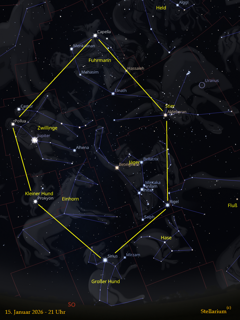 Im Januar ist das Wintersechseck am Abendhimmel in südlicher Richtung ideal zu beobachten.