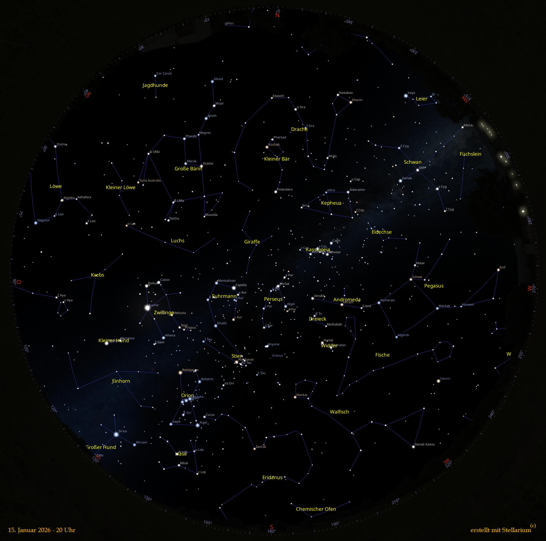 - Jupiter erreicht am 10. Januar seine Opposition im Sternbild Zwilling und ist die gesamte Nacht über sichtbar
